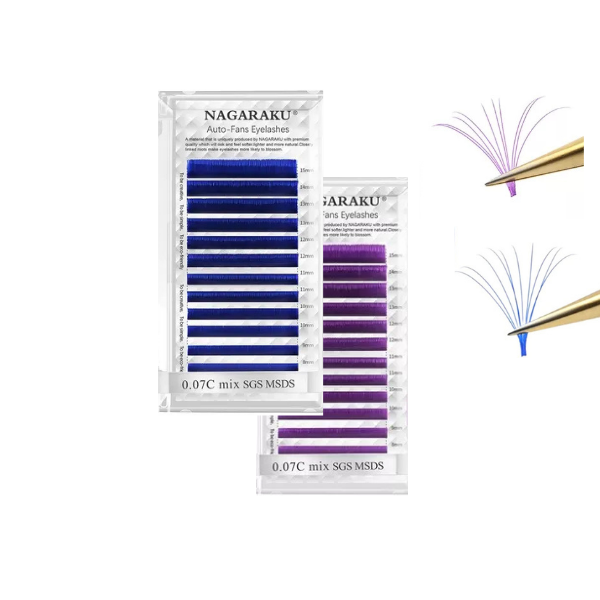 Las pestañas Nagaraku Autofloración en tonos azul y morado están diseñadas para lashistas que buscan añadir un toque de color y creatividad a sus sets. Gracias a su tecnología de autofloración, los abanicos se forman prácticamente solos al tomarlos con la pinza, reduciendo el tiempo de aplicación y garantizando una apertura uniforme.