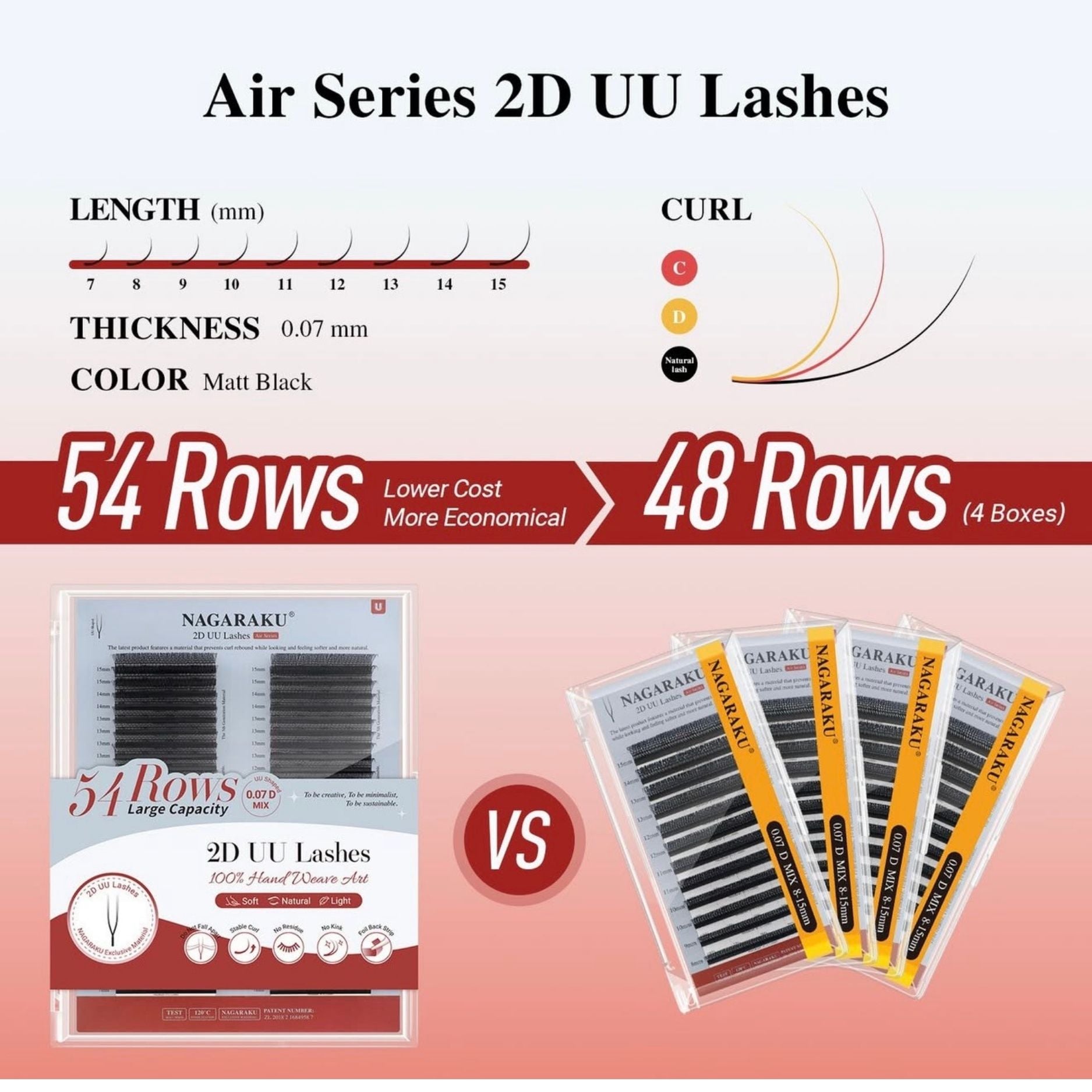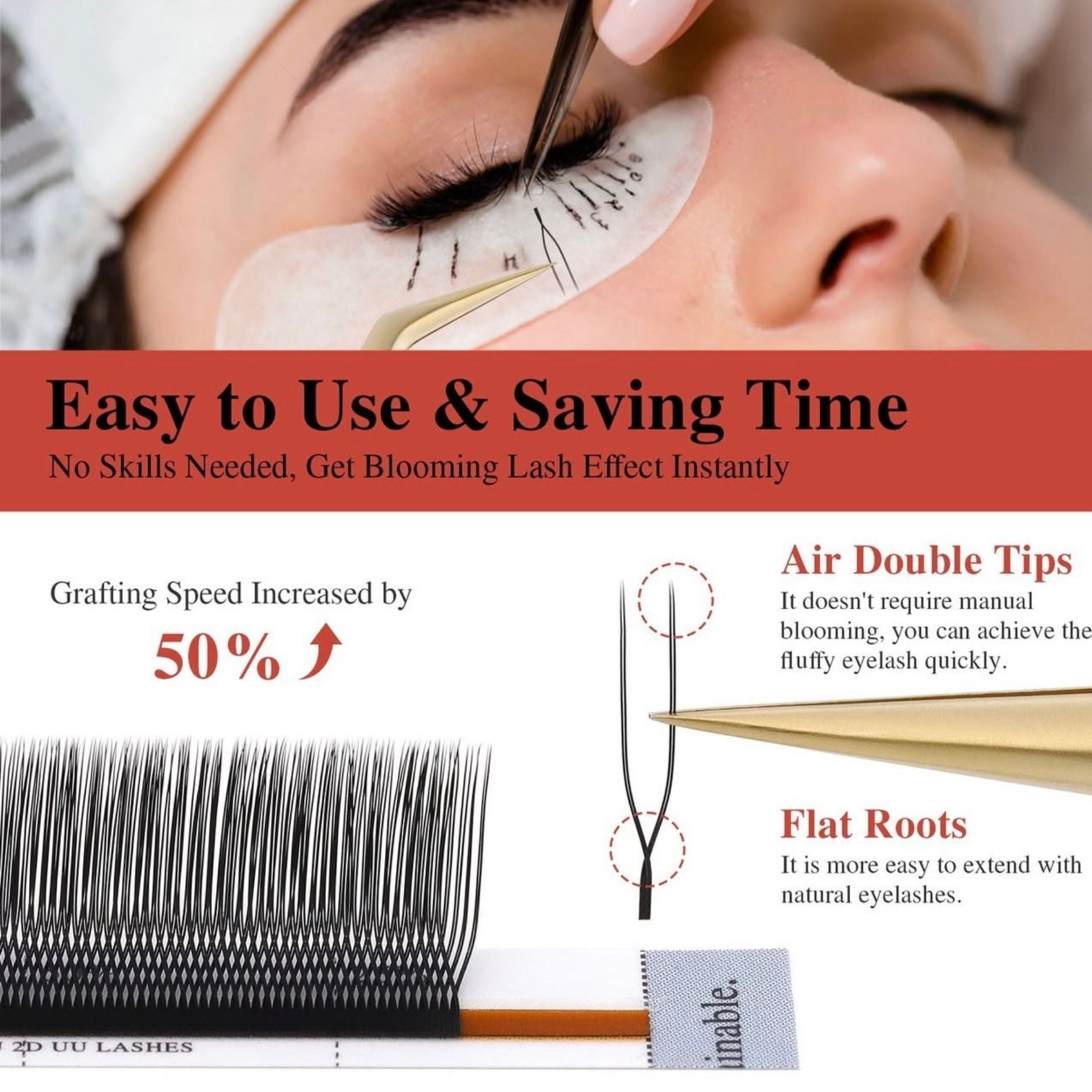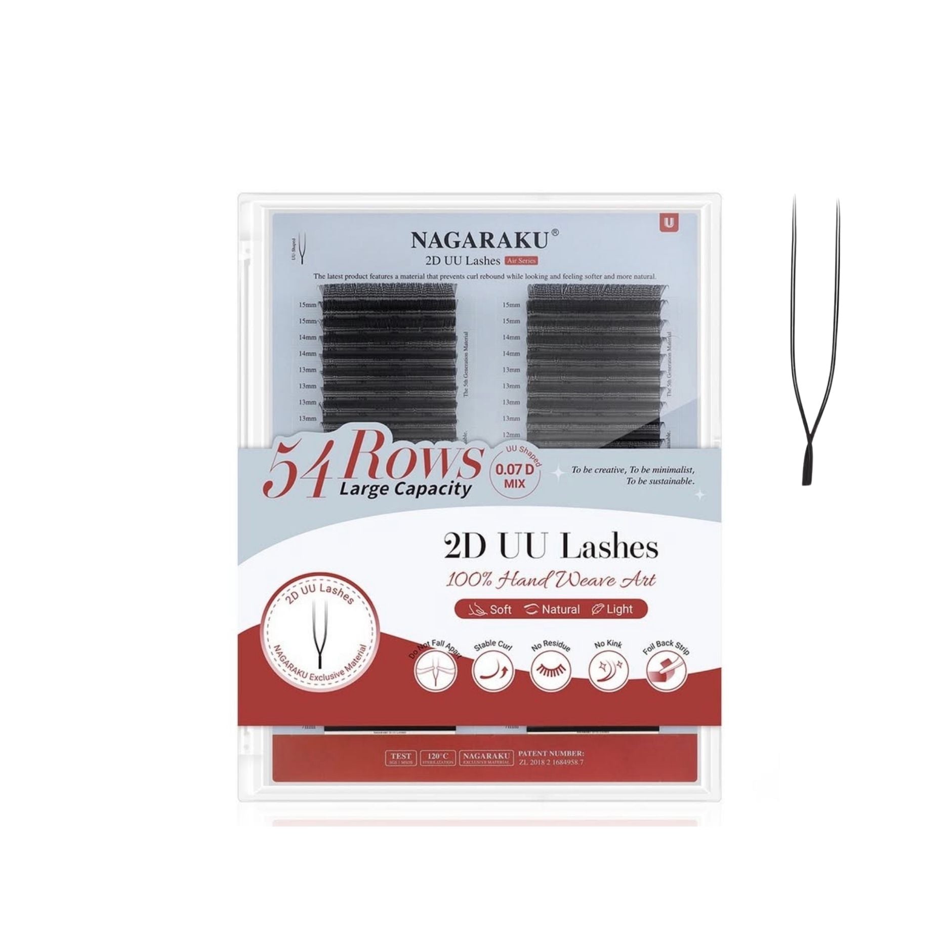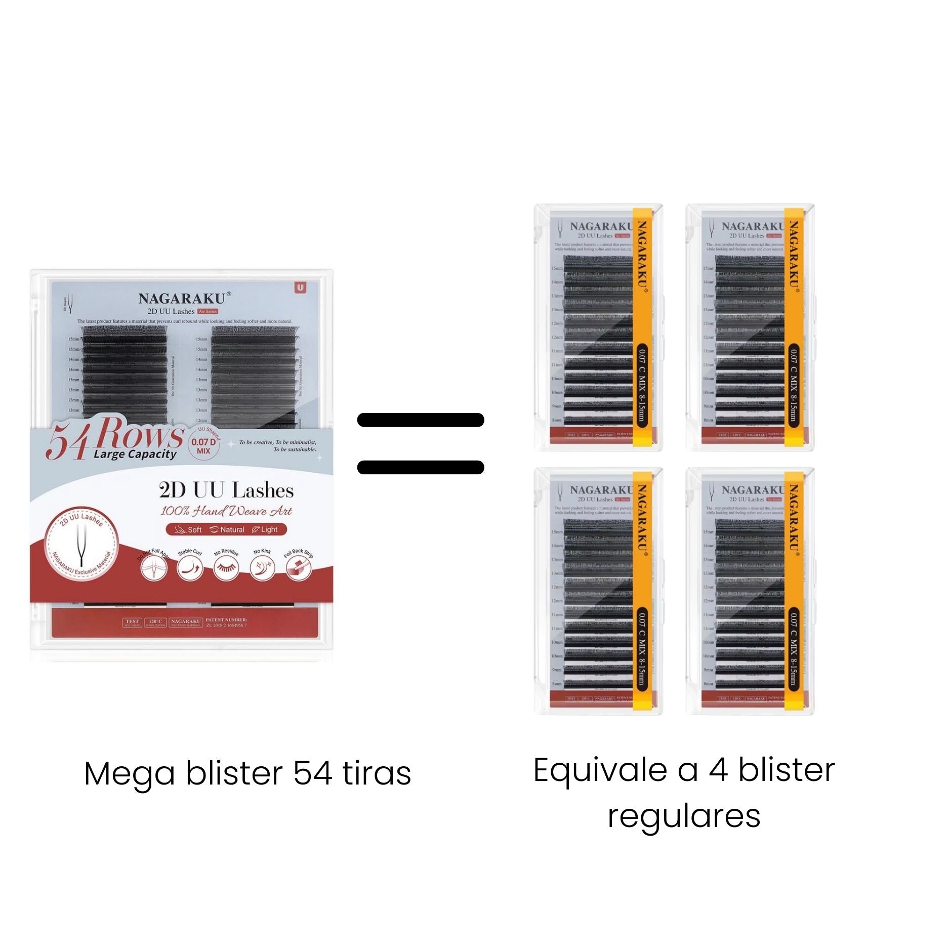 El Mega Blister 2D UU de NAGARAKU ofrece máximo rendimiento para lashistas que buscan trabajar más rápido, con mayor capacidad y un acabado impecablemente natural. Su diseño UU (doble punta) crea un efecto esponjado y elegante sin necesidad de hacer blooming manual, aumentando la velocidad de aplicación hasta un 50%.