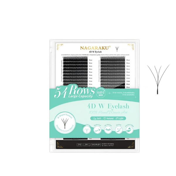 El Mega Blister Nagaraku W 4D está pensado para lashistas que buscan más producto en una sola presentación, optimizando tiempo y costo. Contiene 54 filas de abanicos W 4D listos para aplicar, equivalente a 4 blísteres regulares, con una distribución de medidas perfecta para crear sets completos y variados.