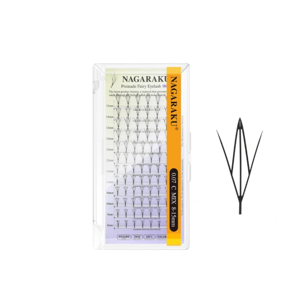 Las extensiones de pestañas NAGARAKU Fairy Premade están inspiradas en el estilo “fairy” o “anime”, con puntas marcadas y separadas que aportan un efecto etéreo y expresivo, similar al de los personajes de anime. Su diseño logra un look llamativo y ligero, manteniendo siempre la comodidad para la clienta.