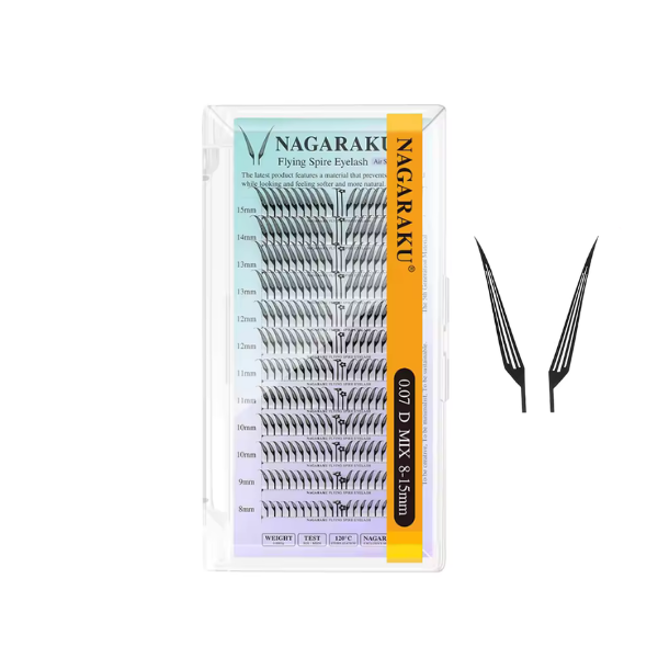 Las pestañas Flying Spire Nagaraku son ideales para lashistas que buscan un acabado definido y profesional en sus aplicaciones de volumen. Su diseño en abanicos pre-hechos con base angosta permite mayor velocidad en la colocación, reduciendo el tiempo de aplicación hasta en un 50%.